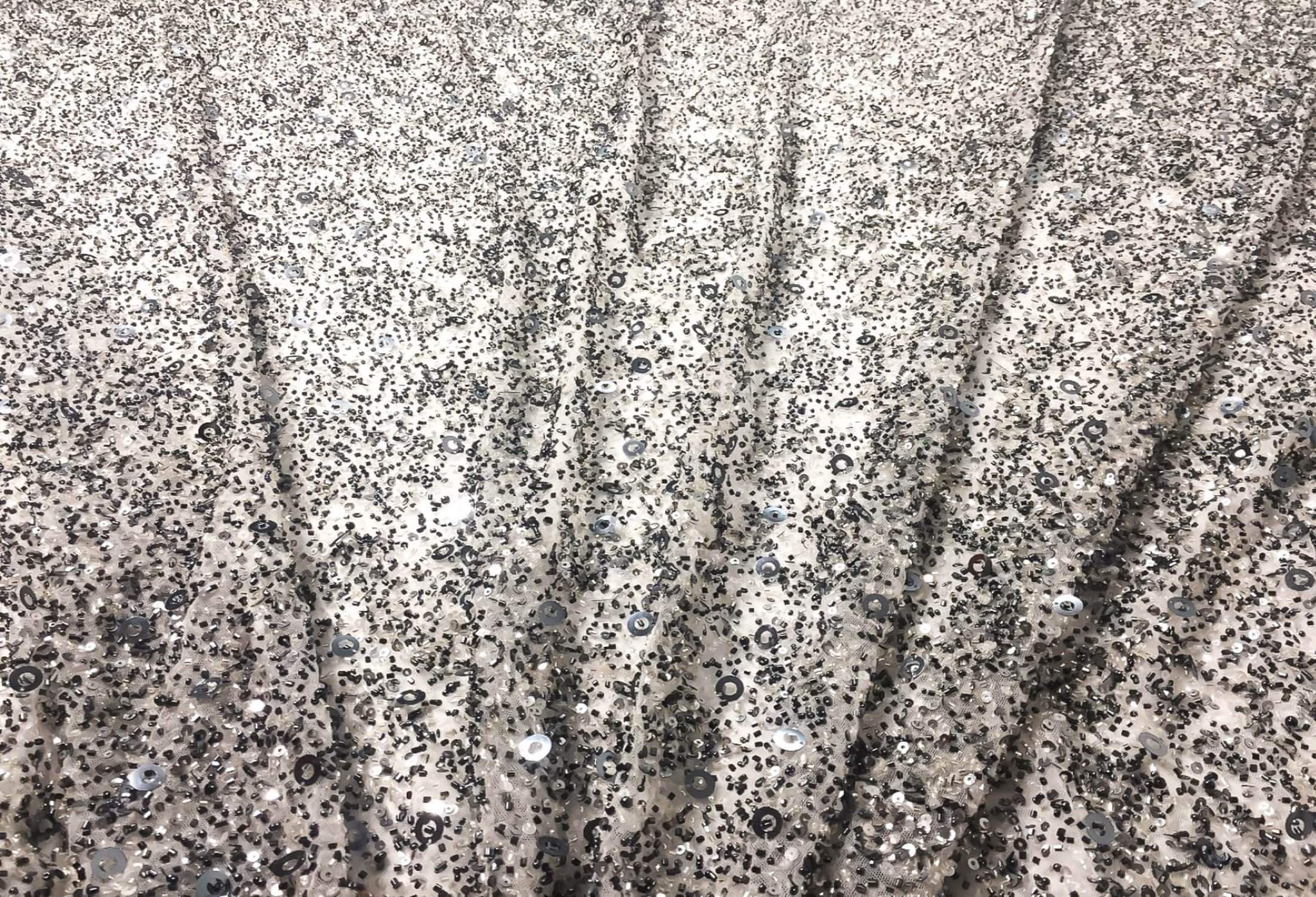 Crowded silver/gray beads and sequins- white Handmade lace