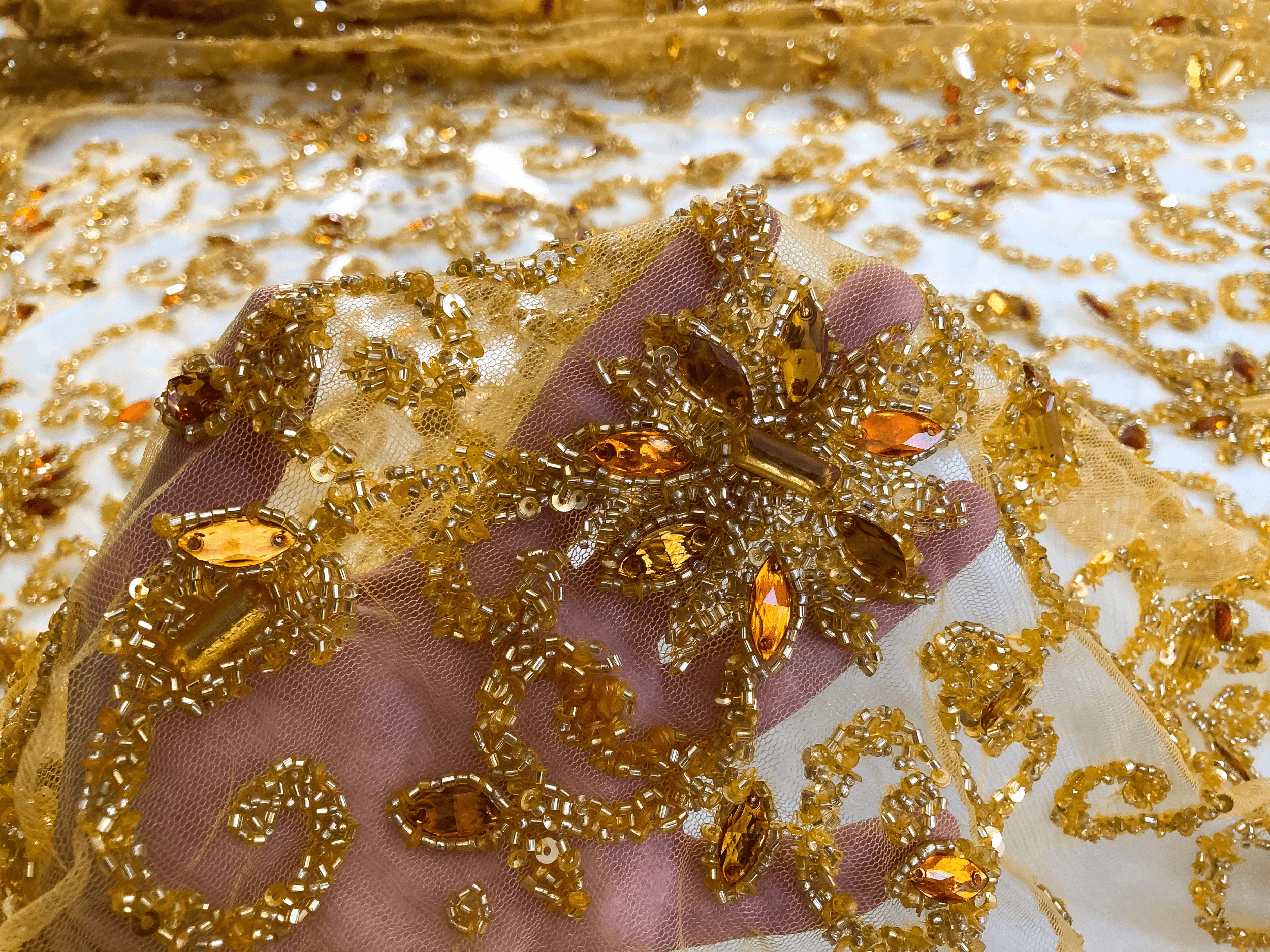 Luxury Handmade 3D beads and crystals flowers - Mustard beaded mesh
