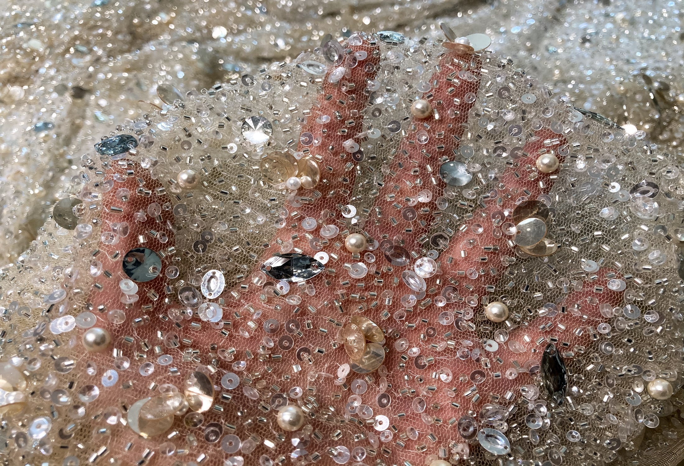 Silver Fairy Rain of beads, sequins & crystals- Handmade cream mesh